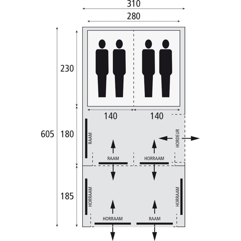 - De tent heeft een lengte van 605 cm.